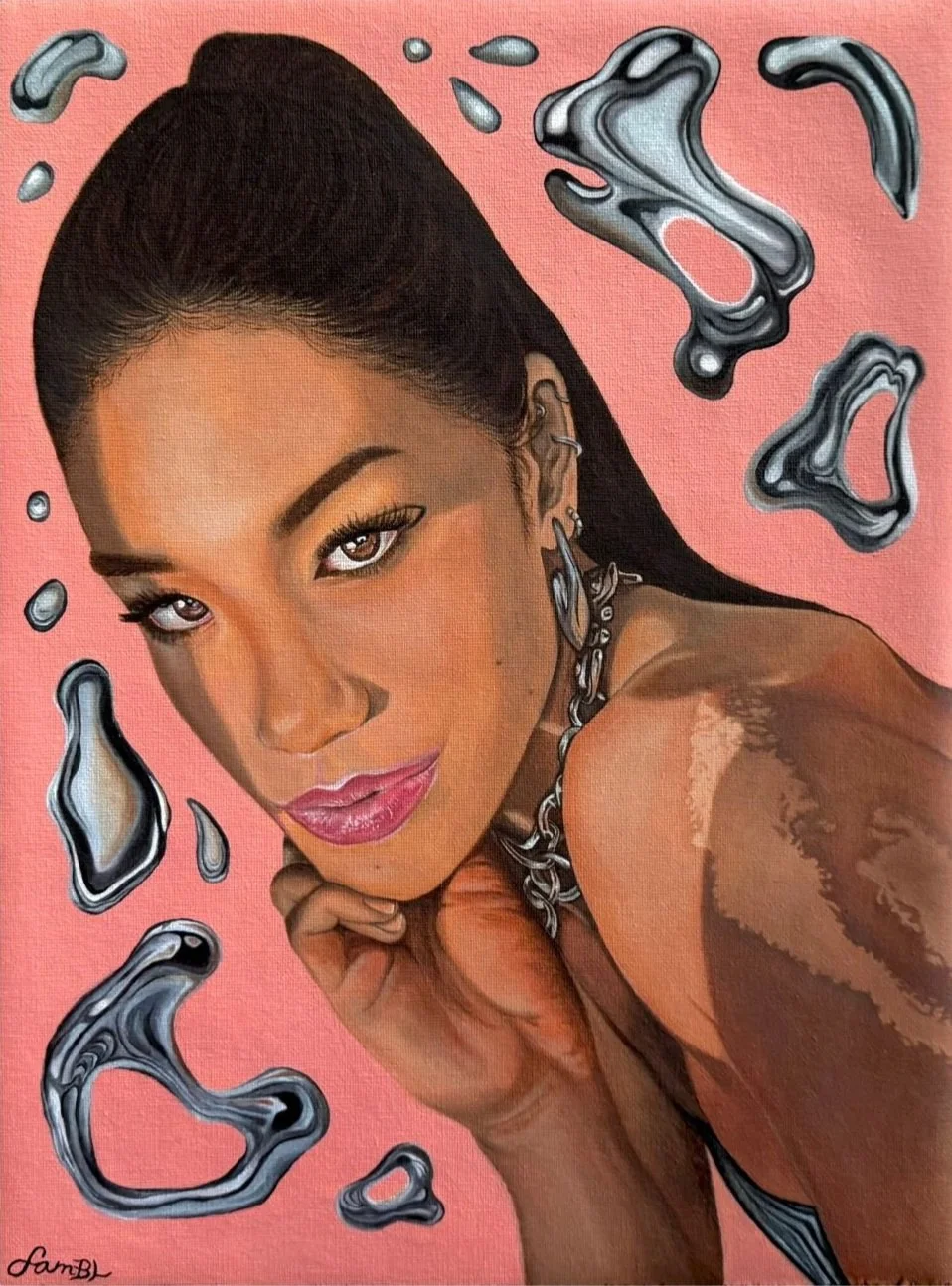 Initially, the composition felt too bare against the soft pink background, so I introduced floating metallic orbs around my head, inspired by the necklace I was wearing. These elements added balance and ultimately inspired the title. Alloy is an ode to those orbs: a symbol of strength, fusion, and contrast between organic and synthetic.